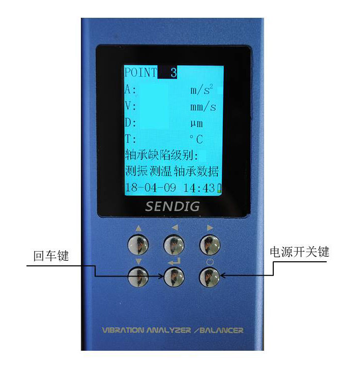 4、按”回车键”,光标停在 “测振”上,再按“回车键”开始测量各个参数,屏幕上会显示“正在测量加速度”→“正在测量速度” →“正在测量位移” →“正在测量轴承数据”,直至测量完毕,光标返回序号处。