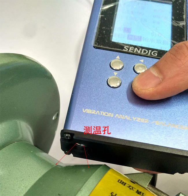 5、此款轴承检测仪,还可以测温度,测温传感器在仪器下端,测量时测温孔对着设备,距离1-2厘米为佳,测的温度是如下图中两条红线范围内的平均温度。
