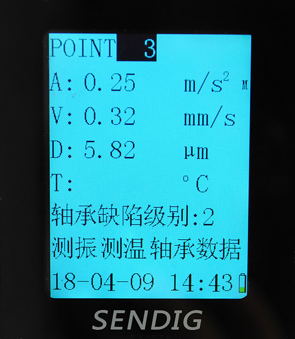 7、参数测量完毕,除了测得各项振值外,还会显示“轴承缺陷级别”,这个值越小,轴承运行状态就越好。这里要特别说明一下,有的新轴承,需要磨合,所以测得值大是正常的,一般运行一段时间后,磨合好了,轴承参数也就会降下来。