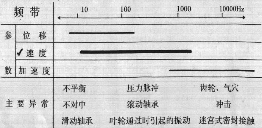从频带(频率的范围)角度说,低频振动适合测位移,中频振动适合测速度,高频振动适合测加速度值。可参见下图。