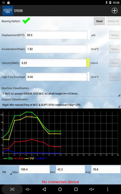 Android system & sensor connected by Bluetooth, can measure bearing condition, acceleration, velocity & displacement. Instant overall value & trend display. Measured value saved as files. Alarming according to ISO-10816 for machine health.
