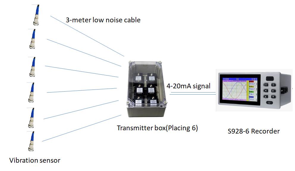 S908A Vibration Transmitter + Recorder, 6 Channels, Continuous monitoring, LCD display, Data save locally, Unloadable by USB flash disk, digital output by RS485, through converter can use GPRS, Modem, Radio, fiber to HMI, Internet…